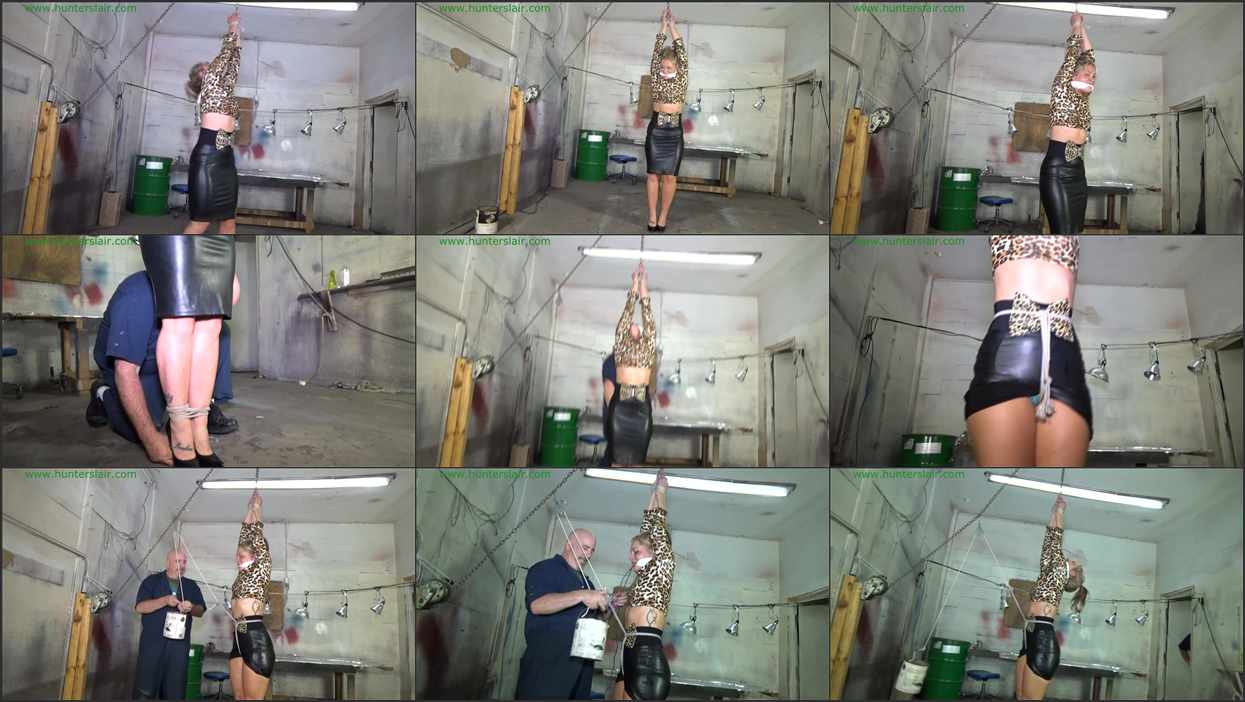 The Hunter has sexy blond Adara strung up by her bound wrists in the lair. While elastic bandage is pulled between her teeth to keep her quiet. Adara struggles helplessly while she awaits her unknown fate at the hands of the Hunter. He comes in and cranks her wrists up higher above her head, stretching her up onto the balls of her feet. He then ties a rope around her waist and pulled the rope down between her legs and buries it deep in her panties. Adara’s pussy is split in two by the crotch rope. He attaches a pulley to the chain above her head and then runs the end of the crotch rope through the pulley. Adara watches in XXXX as he then ties a gallon of paint to the end of the crotch rope. She begs and cries, shaking her head no, in terror as he lowers the paint can letting her feel the full weight as it pulls the crotch rope deep into her pussy. He leaves her struggling as the heavy can of paint swings in the air pulling the crotch rope deeper into her cunt. The Hunter comes back in with a short leather cord and lifts the paint can up…
