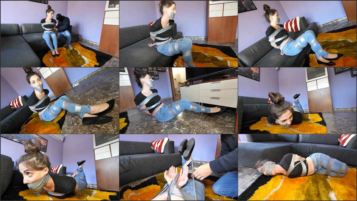To ensure her silence, he seals her mouth with a gray tape gag and leaves her there, struggling, while he moves through the house.