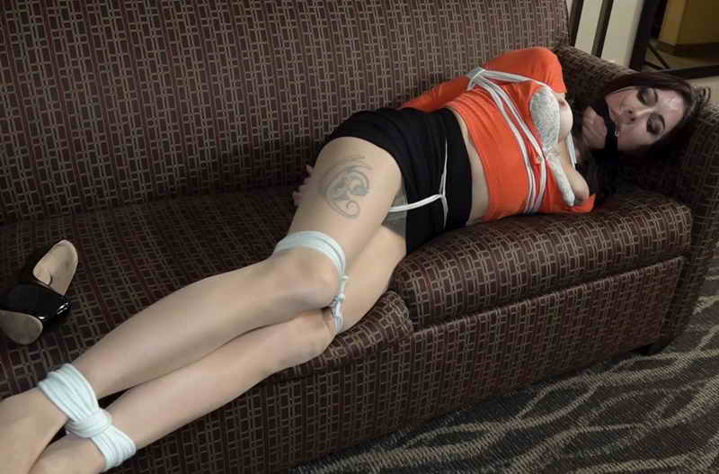 He has Agatha bound and gagged in a hotel, waiting for his boss, who is Agatha’s boyfriend, to show up. But Agatha loves being tied up and gagged and, is very turned on. When she hears that it is going to be a 4 hour wait, she decides that she cannot wait that long. She wants to suck and fuck now. She gets the man to remove the gag so she can tell him that she wants to suck and fuck him. She promises it will be their secret. The man is reluctant, but cannot pass this up. A short while later, he has Agatha’s head bouncing up and down on his lap. When they are finished, he makes her swallow it all and then gags her again. At her request, he ties a piece of rope up her pussy and leaves her with her tits out. This only get Agatha more horny. So, when the man returns, pulls her pantyhose down and her panties aside, Agatha is more than ready for him to stick it in her.