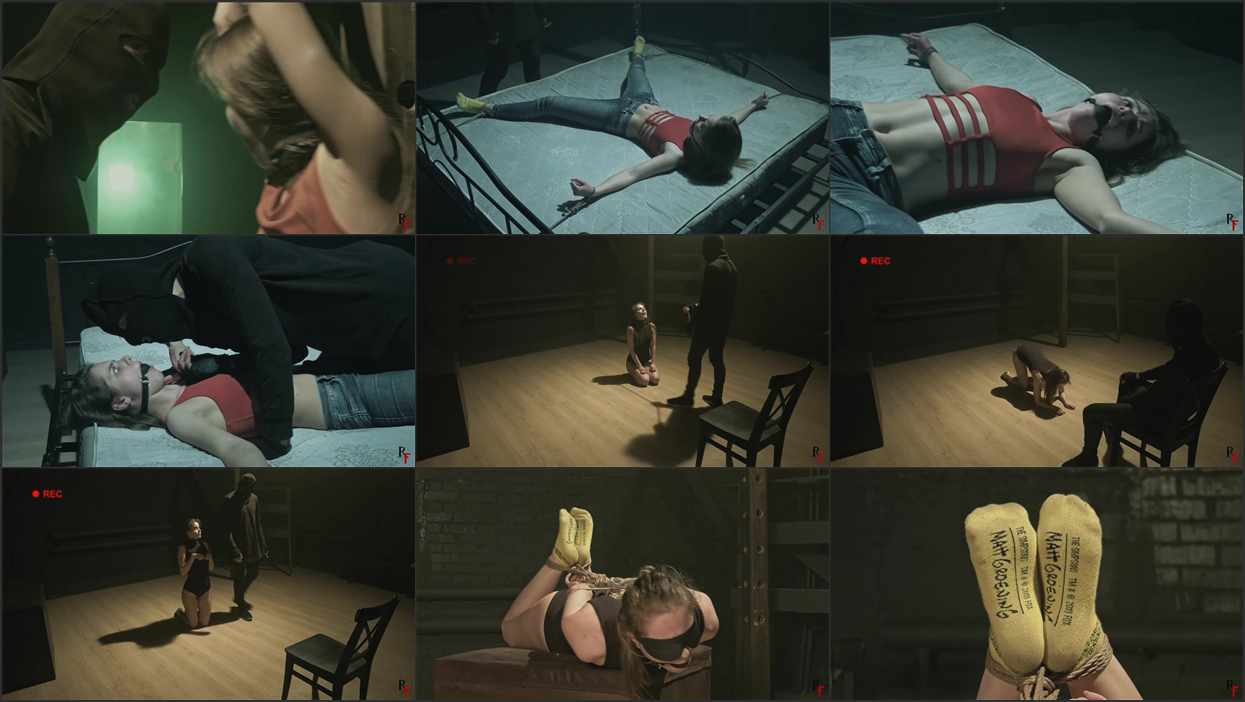 Leya is taken to the bed and restrained spread out on her back with a ballgag in her mouth. The handler tests her resolve, then switches tactics and goes after what gets results: her socked feet. A paddle comes down on her soles again and again – pain, pressure, discipline – while Leya tries to endure and hold out.