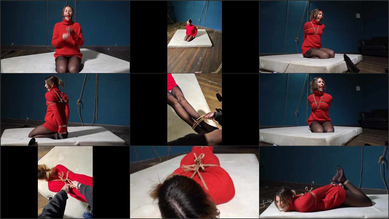 Alana loves sweaters and she really loves the big red one. wearing dark tights she adds a ballgag nice and tight and is soon hogtied with the thick old ropes.