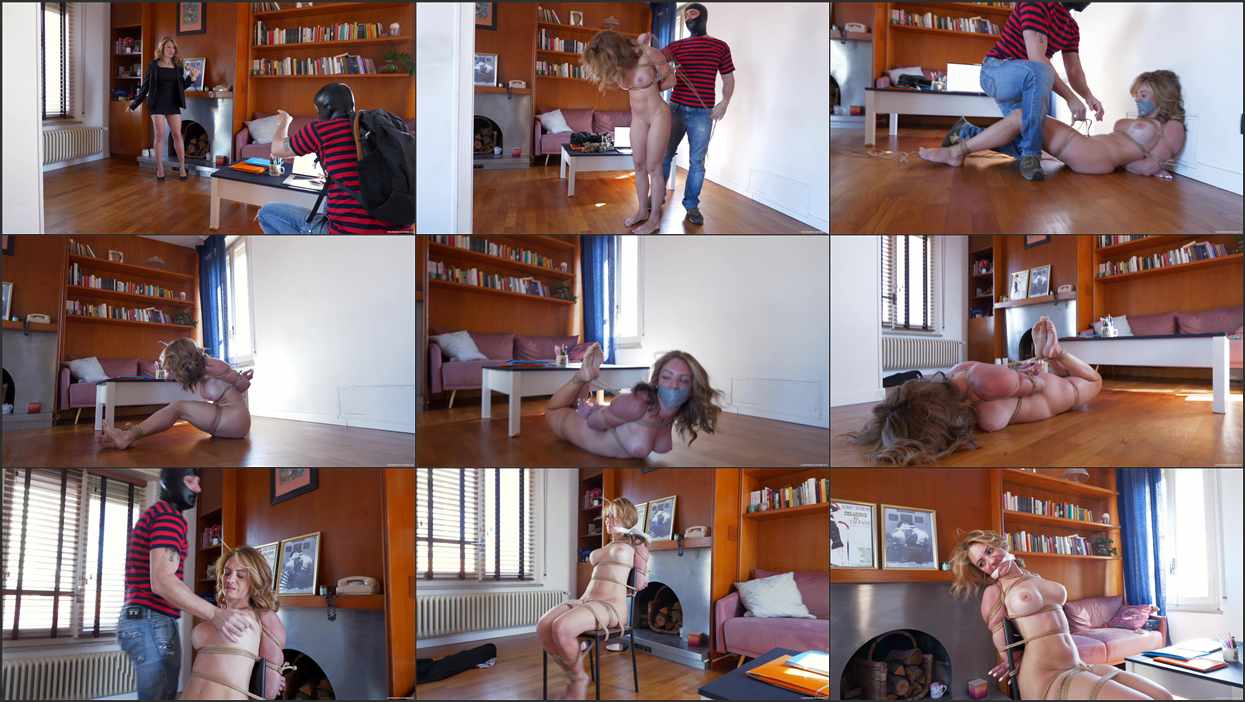 Alba Zevon is arriving home from work, unaware that a thief has entered her apartment and is going through files on her computer. She hears a sound as she lets herself in, and immediately confronts a masked man. It would have been better to run, because now he won’t let her go to raise the alarm. He orders her to remove her clothes so that he can tie her up naked. Alba protests but is helpless to stop the intruder restraining her, ultimately leaving her in a tight hogtie on the floor, a cloth pushes into her mouth and layers of duct tape completing her gag. The thief goes into another room and finds a safe, and spends time trying to get it open while his captive struggles with the tight ropes around her body. When he has no luck opening the safe, he returns to ask Alba for the combination. She merely swears at him, making him angry and leading to being untied and tied up again, this time to a chair. Eventually, the thief helps himself to her financial documents to help him gain access to her bank account, and leaves her sitting there, naked and embarrassed, facing the prospect that when someone does come to rescue her, her embarrassment will only increase.