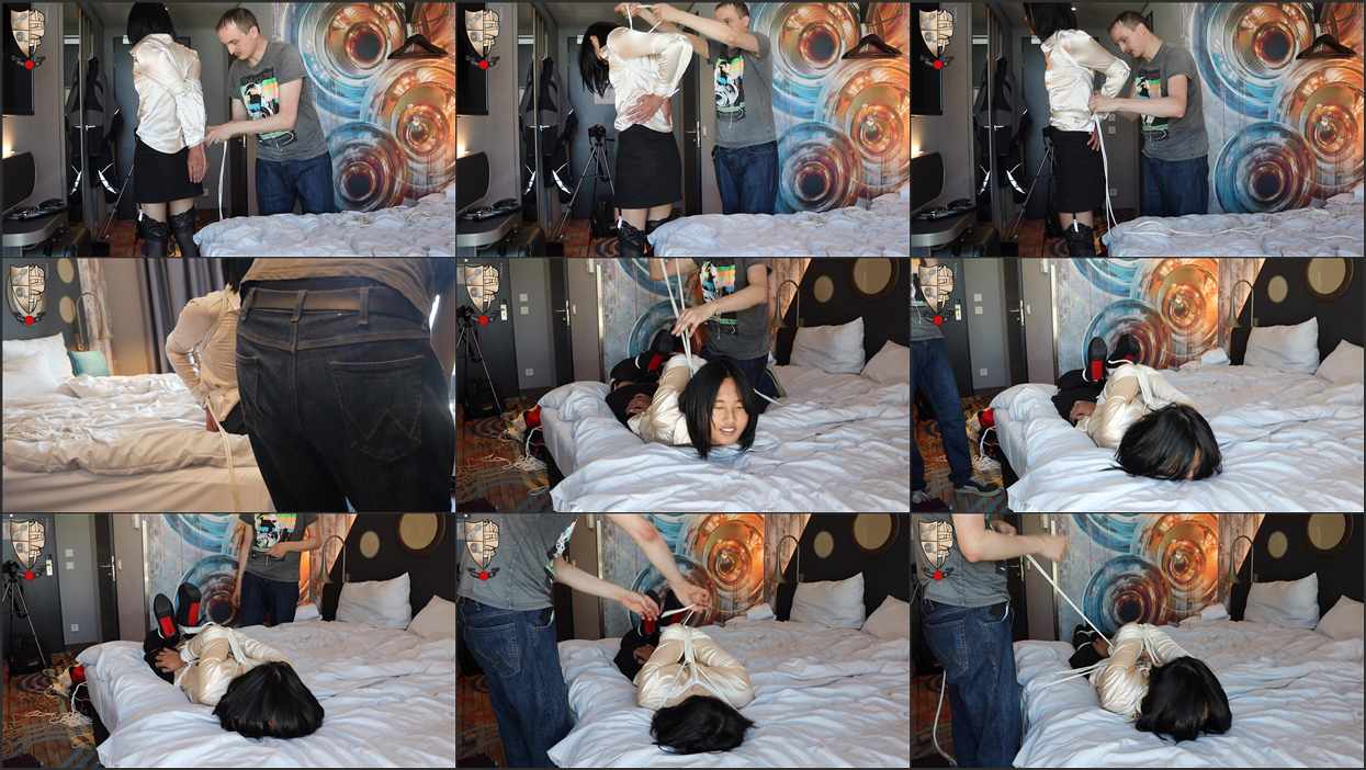 This was just a bondage “Test Run” for Kiwi Girl Allie Bowstring, our very first meeting, but a tight one! I tied her elbows and cranked her into tight chicken wing hogtie and she loved it. Onscreen Tying.