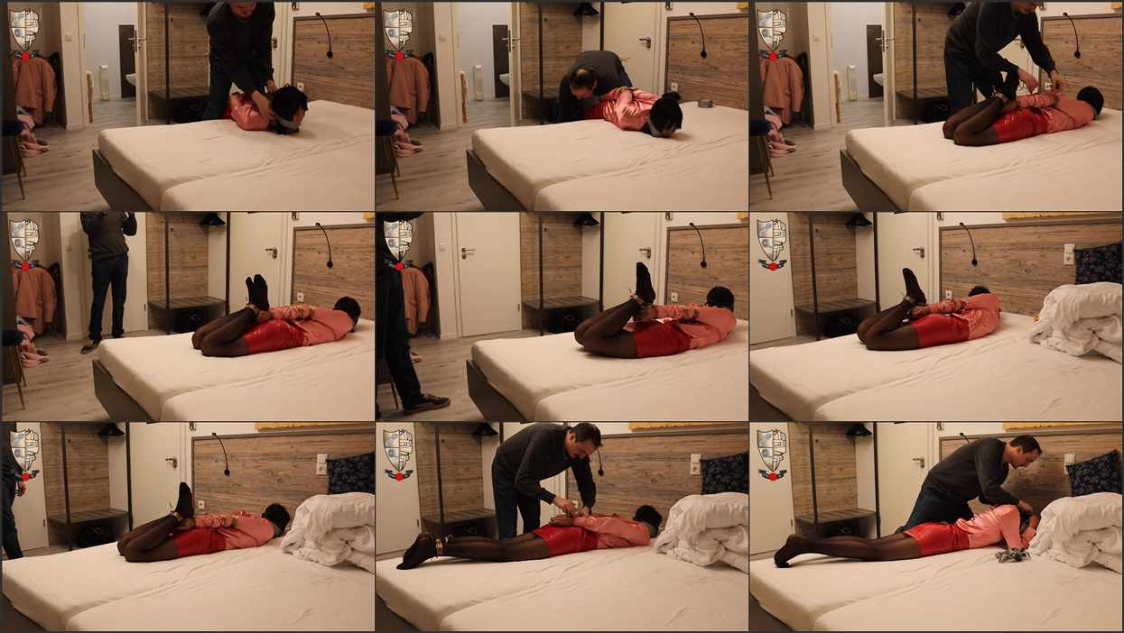 Allie Bowstring is overpowered and tied into a hogtie with speaker wire as she enters her hotel room. She ends up gagged and blindfolded on the bed! Onscreen tying!