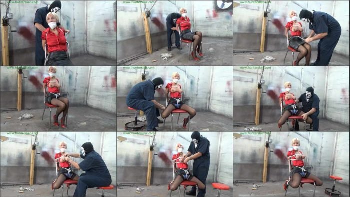 Busty blond MILF Amanda is carried into the lair over the Hunter’s shoulder with her wrists tightly tied behind her back. The Hunter drops her into a chair and clamps his hand over her mouth and pulls an old rag out of his pocket. Amanda’s eyes go big when she sees the rag and realizes that he intends to stuff it into her mouth to gag her. He fills her cheeks with the huge rag then seals her mouth shut with layers of white elastice bandage. Rope are then run around her shoulders, chest and arms pinning her torso to the chair. He ties another rope around her tiny waist then pulls that rope down between her legs and buries it deep in her lacy panties, the end of the crotch rope is pulled between her bound wrists pinning her hands to her ass. Her legs are then pulled back and her ankles are tied to the sides of the chair, spreading her legs wide apart. He pulls out her huge tits and binds them tightly together in a brutal tourniquet of rope. Amanda looks down at her big beautiful tits as then begin to swell and throb from the brutally tight rope. She realizes that there is no escape from the cruel ropes as the Hunter leave her alone to suffer and struggle in the cruel bondage.