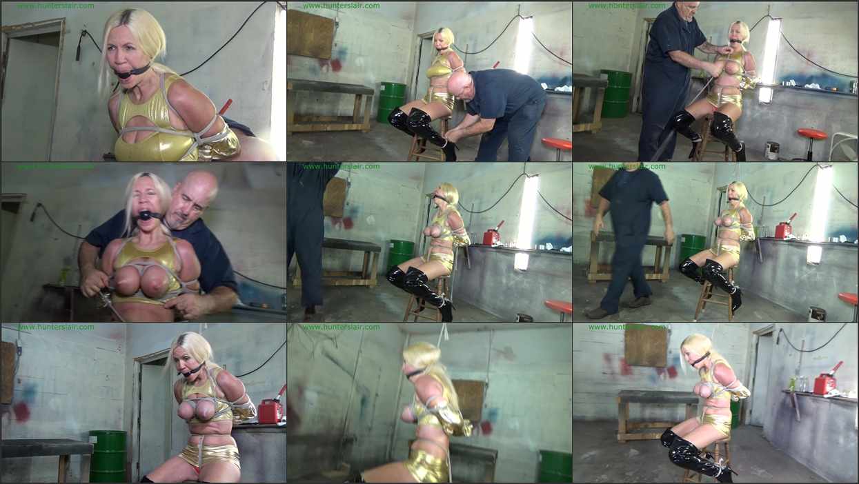Hot busty blond MILF Amanda is pushed onto a stool in the lair with her arms crossed and folded together bound in a hammer lock behind her back. Her shiny glove mini skirt barely covers her ass and her huge tits stretch the shiny gold fabric of her crop top. The ropes bited deep into her arms, wrists and shoulders, the thin fabric of her shiny gold spandex shoulder length gloves offer her scant protection from the tight biting ropes. A black rubber ball is strapped between her teeth keep her quiet. He Hunter ties a rope around her tiny waist then pulls her to her feet and pulls the rope down between her legs and buries it deep in her tiny, lace panties. The crotch rope splits her pussy in two as he sits her back on the stool and ties the end to the crotch rope to the legs of the stool to keep her ass firmly planted on the stool. Her booted ankles are next pulled up and lashed to the legs of the stool so her feet are off the floor. Amanda is afriad to move, precariously perched and helpless atop the stool as she watches the Hunter grab more ropes. He comes back and frees her huge tits from inside the skin tight fabric of her crop top. Ropes are wrapped around her arms and chest, framing her big tits in the ropes. Ammanda begs and cries into her gag as her tits are then brutally bound in a tourniquet of ropes…