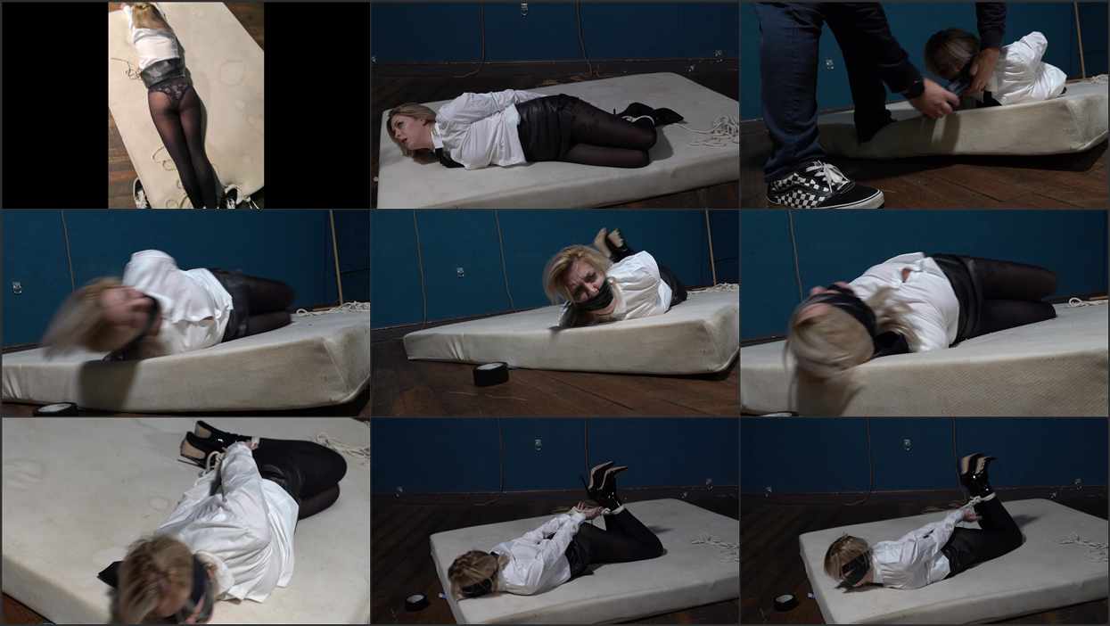 Amber is in trouble again. White shirt, tie, short black leather skirt, dark tights, black boot heels, she gets tied on the mattress and wrapgagged with black tape. A blindfold is added for good measure.