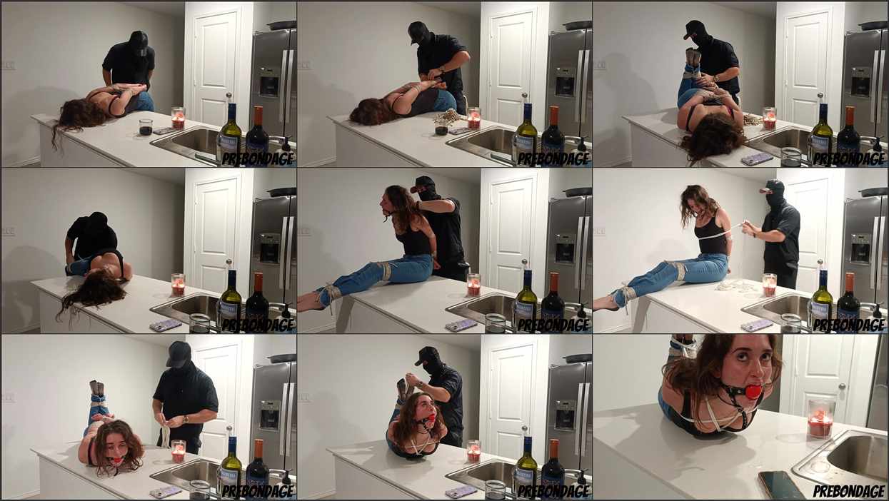 Ann Lynn is enjoying a peaceful night alone at home when she hears the door open. When she goes to investigate, thinking her husband has come home early, she finds nobody there. Strange she thinks but as she walks back to the kitchen a large masked man grabs her from behind. The ropes start flying and soon she finds herself tightly tied up on the counter top. Before being put into a tight hogtie a large ballgag is stuffed into her mouth which induces her to heavily drool. Her captor spanks her a few times before eventually leaving her alone agian to enjoy her now not so peaceful evening.