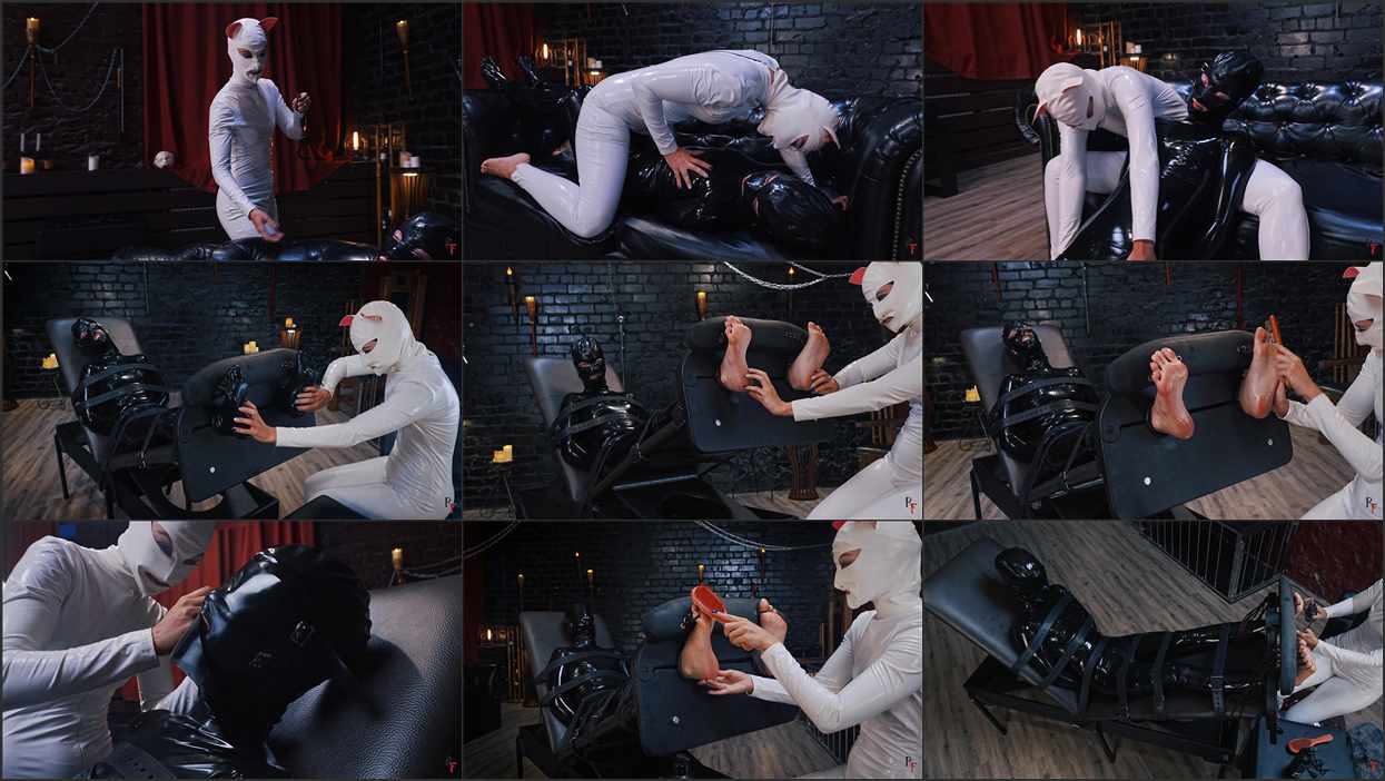 Then Penelopa removes the latex from Anna’s feet and tickles her soles with her tongue, gently biting them. After that, she oils Anna’s feet and tickles them more intensely using combs.