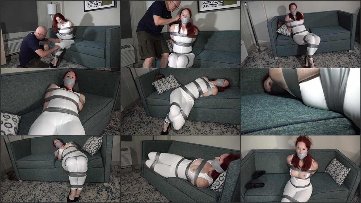 He caught Araneae snooping around in his place and she has seen too much. So he quickly tapes her up, very tight. Then to shut her up, he stuffed her mouth and taped it shut. He then left Aaeae struggling bound and gagged.