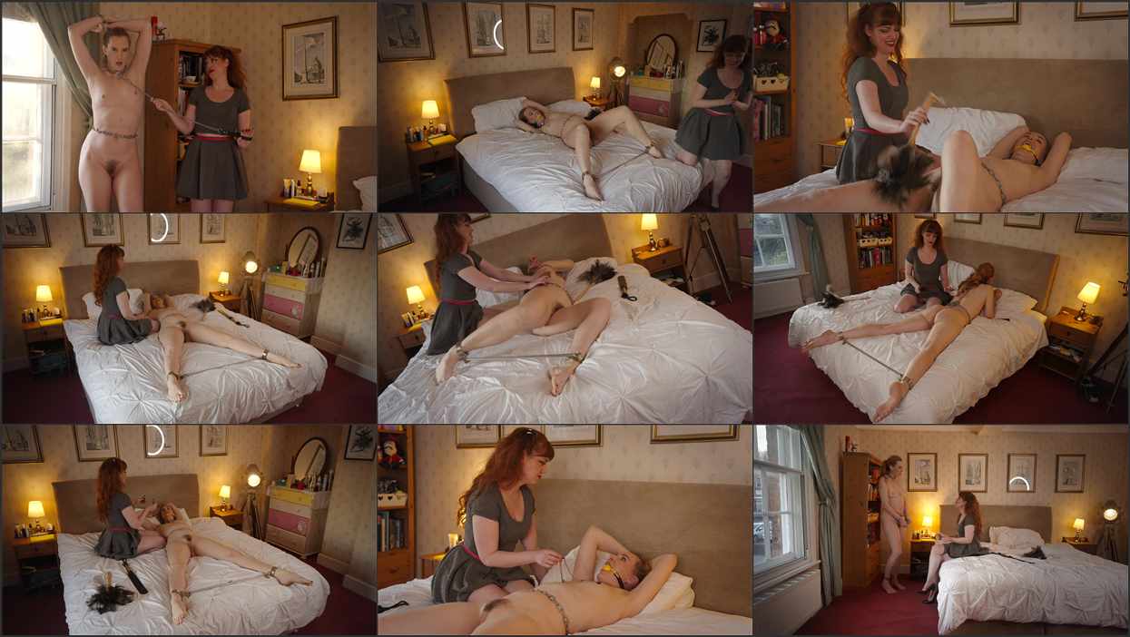 Zoe pushes Arie down on the bed and gags her, then spreads her legs with an ankle spreader bar to make her vulnerable and humiliated. After all, she says, Ariel just loves spreader her legs. How to punish her? Zoe reaches for the tickly feather duster and sets too on Ariel’s ribs and thighs and pussy. That’s not as satisfying as using her sharp fingernails though, and what if Ariel has ticklish feet? Oh, she does! The reaction to that is rather nice! Zoe is determined to really teach Ariel a lesson with tickle torment. Ariel rolls over to avoid her tickling talons and presents her bottom for punishment. Tickle? No, spank! Zoe reaches for a long leather paddle to punish the cheating blonde. Ariel’s really going to pay this time! And are those nipple clamps?