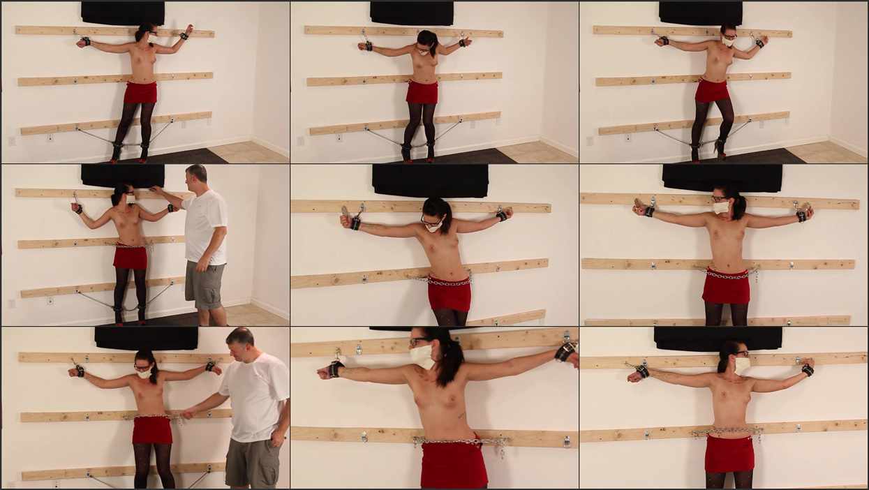 Ariel likes a good challenge and I’m more than happy to give her one. It didn’t take much to chain her to the wall and add a foam gag to keep her quiet. I just sat back and enjoyed her struggle; especially as her skirt kept hiking up her pantyhosed legs. After a while though her vulnerable position gets to be too tempting. Ariel tries to squirm away but the chains hold fast. I try to decide to add more chain or maybe a bit of ticking. Both. Definitely both.
