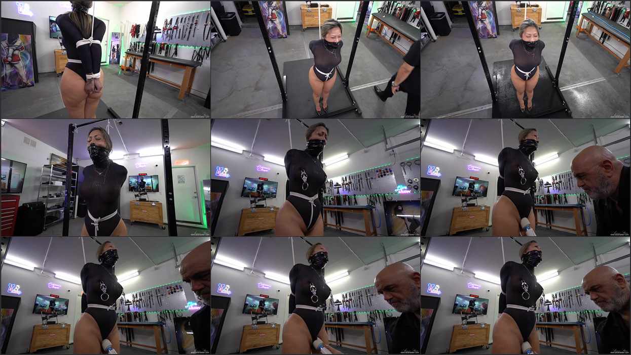 After gagging myself with the 60mm ball, it was instant regret when Martin wrapped it over with vinyl tape. I can take some big gags for a long time, but a tight wrap around my face can bring me to my knees. It was a real struggle for me and Martin knew just the thing to divert my attention but I had to endure the clovers first. It was the nipple clamps with my elbows pinned, the giant ball gag followed by an extreme wrap gag, all while standing in heels with a tight crotch rope. It was so much all at once! Top that off with my reward and I melt into an orgasm.