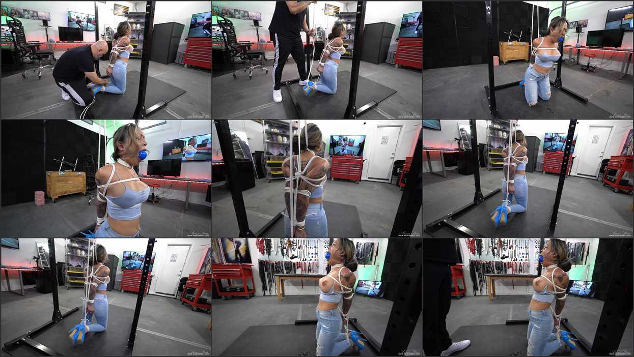 I love a casual, yet strict position to match my casual outfit energy. Tight jeans, heels and a tiny top calls for a me to be on my knees with my elbows crushed and my tits pulled out of my shirt, followed by Martin’s signature neck rope to the ceiling with my arms pulled to my ankles. The big gag is the base and the nipple clamps are the sprinkles – and when he adds these, they never fails to escalate the situation.
