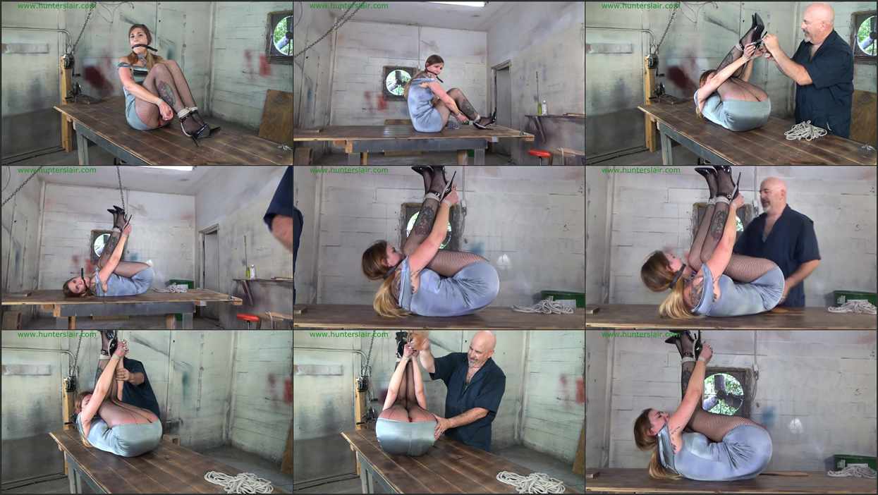 Pretty Ayla struggles in rope perched atop the Hunter’s punishment table. Her wrists are tied together under her knees and her ankles are tied. A ballgag has been pushed between her teeth and strapped in tight. Ayla twists and turns her body as her nibble finger try to find the knots holding her ankles together. She thinks if she can free her ankles then hopefully she maybe able to slip her wrists under her stiletto heels and escape before the Hunter returns. But it is not to be as the Hunter returns with more rope. He rolls poor Ayla over onto her back then using a short rope her wrists are cinched and tied to her stiletto heels. He then pulls a chain down from an overhead pulley and attaches her wrists and ankles to the chain. He cranks up the winch stretching her body so her ass is exposed under the shiny short skirt of her mini dress. He shows her his leather paddle and as Ayla begs and pleads into her gag he begins to spank her ass with the leather paddle. Ayla screams and yelps into her gag each time the paddle finds its mark on her vunerable ass. Ayla twists and turns her ass in a futile attempt to avoid the paddle but it is useless there is nothing she can do to prevent the paddle from hitting its mark. Her ass feels like it is on fire as the Hunter continues his relentless spanking. Finally he stops and leaves her sobbing and crying still on her back with her red throbbing ass in the air.