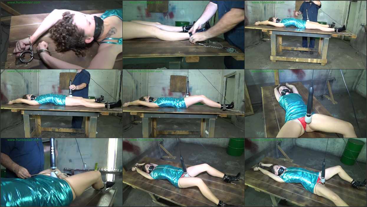 Petite Bailey struggles on the Hunter’s table laying on her back with her hands locked in steel cuffs above her head. The handcuffs are run through a ring mounted on the table and her mouth is sealed shut with layers of tape wrapped around her head. Bailey struggles frantically, kicking her legs up as she twists and turns trying to pull her hands through the cuffs. But the cuffs are too tight, there is no slipping free. The Hunter comes in with a couple of sets of legs shackles and spreading her booted ankles apart he locks the cuffs around each of her ankles stretching her out spread eagle on the table. Bailey can only watch helplessly from the table as he pull out a wand vibrator and begins to taunt and tease her bound body with the vibrator. He then pulls a chain down from an overhead pulley and ties the wand vibrator to the end of the chain so the head of the vibrator is level with her pussy. He turn on the vibrator and watches as poor Bailey squirms and struggles on the table as the vibrator begins to stimulate her pussy. The head of the vibrator bounces and swings as she struggles giving her stimulated pussy a moment of relief before it rests against her pussy again. Bailey begs and cries into her gag as she wants to cum but each time she feels an orgasm build up inside her the head of the vibrator swings away. The Hunter grabs some rope and ties rope around her thighs and then the head of the vibrator to stabilize it, then a rope is tied to the head of the vibrator and run up and ties around her neck to keep it pressed against her pussy. He leaves poor Bailey struggling helplessly in her handcuffs as the vibrator brings her to multiple orgasms.