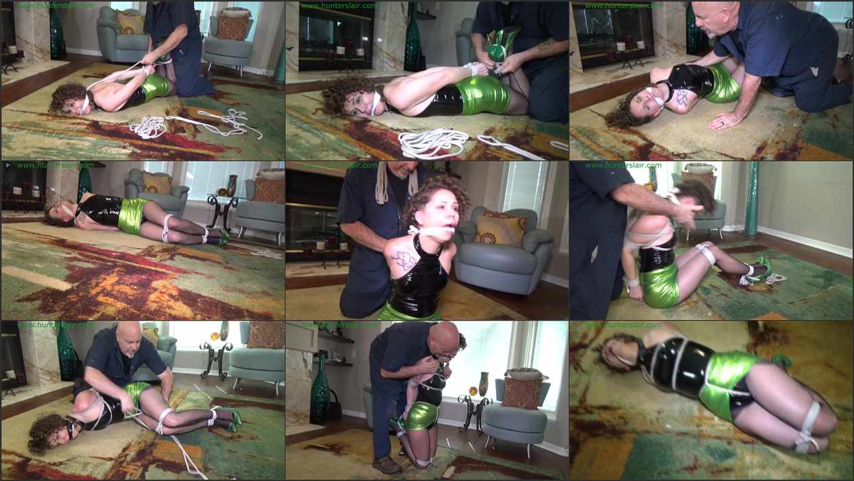 The Hunter carries tiny Bailey into the living room slung over his shoulder bound and gagged. Her slender wrists are tied behind her back and an old torn sheet is pulled between her lips. Her stiletto heels flail and kick in the air as she begs him through her gag to let her down. He finally lowers her to the floor and quickly ties her ankles and knees tightly together. She is left to struggle desperately on the floor, Bailey rolls around on the carpet trying to reach the knots holding her ankles together with her outstretched fingers. She moans and cries in frustration when she can reach the knots. The Hunter returns with more rope and sits her up then wraps the ropes around her upper arms. Bailey grunts and groans through her gag as he slams her elbows together behind her back and then wraps the rope around her chest before cinching her elbows tightly together. The Hunter pulls out a roll of shiny black eletrical tape and pulls it between her lips over the cleave gag. He wraps the tape around her head, pulling her gag deeper into her mouth wedging it open. Another rope is tied around her tiny waist then pulled down between her legs, he buries the rope deep in her pussy then runs the end of the crotch rope up between her tighlty bound wrists. Bailey’s legs are bent and the end of the crotch rope is run from her bound wrists down between her bound stiletto heels. She yelps into her brutal gag as he jerks her legs into a strict hogtie which pulls the crotch rope deeper into her pussy. Once poor Bailey is helplessly hogtied he pulls her up onto her knee point then taunts and teases her as she scream, begs and cries in terror through her gag. He finally lowers her to the floor and leaves her alone on the floor brutally bound, gagged and hogtied. Poor Bailey can barely more the ropes are so damned tight, she can barely even roll over as she sobs and cries in hopeless frustration.