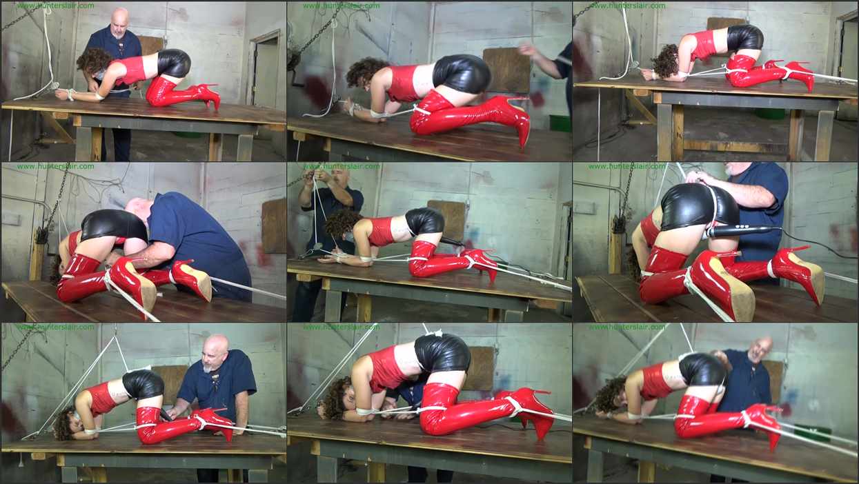 Petite brat Bailey is dragged into the lair by her bound wrists by the Hunter, her heels of her shiny red stiletto boots scXXXX the floor as she begs and cries into her gag. Her mouth has been packed and sealed shut with layers of duct tape wrapped around her head. The Hunter runs the rope tethered to her wrists through a pulley attached to a ring on the tape and ties the rope off the a chain hanging down from an overhead pulley. Her elbows are then tied tightly together and the ropes from her now bound elbows are tied to her knees. More ropes are looped around her booted ankles and tied to a set of rings mounted at the bottom of the table leaving her resting on her knees and elbows on the table top. The Hunter next ties a rope around her tiny waist and runs that rope down between her legs and ties a wand vibrator to her crotch rope with the head of the vibrator pressed against her pussy. The rope tethered to her wrists is then run down from the chain and attached to the rope around her waist and crotch pulling her ass into the air. He turns on the wand vibrator, Bailey jumps and pulls at the ropes as the wand vibrator begins to stimulate her pussy. She struggles desperately in the ropes but she can barely move as she Hunter adjusts the head of the vibrator for maximum effect. He leaves her struggling on the table as the vibrator brings her to orgasm. Bailey’s eyes roll back in her head as she is brought to orgasm again by the vibrator, she doesn’t see the Hunter come back she is lost in her bound ecstacy until she feels the sting of the leather paddle on her wriggling ass. The Hunter spanks and swats her ass with the paddle until she cums again. Then her leaves her alone as she loses control, moaning and crying into her gag as she orgasms again. Bailey fights the ropes but it is hopeless her pussy is destroyed but she still can’t stop cumming.