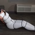 A man has invaded Bella’s home as she was getting ready to go to work. After tying a knotted rag in her mouth to gag her, he makes her sit at the top of her staircase. He uses a plastic flex cuff to secure to a stair post and then goes off to look for something to secure her with. All he can find are more zip ties. He uses them to bind Bella very tightly. He also re-gags her by stuffing and taping her mouth. He then leaves her to struggle bound and gagged. Bella struggles hard to get loose. But all she manages to do, is get her skirt to rise and show she is wearing a long leg panty girdle under her skirt. Later the man comes back and pulls her blouse open to expose her big tits.