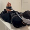Today I’m tied up with bondage straps. You can pull them really tight. I’m also gagged with a large ball gag. He then pulls off my dirty white socks, ties my soles with rope, rubs them with oil, and then tickles them with a pointed plastic stick. Enjoy!
