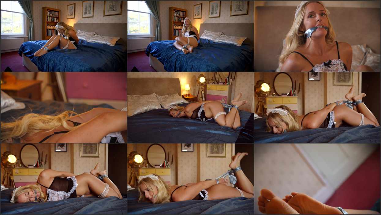 to let her carry on with her maid duties, but for some reason he can’t quite understand her through the satin cleave gag. Instead he enjoys her barefoot struggles on the bed in her French Maid uniform and turns it into a hogtie so he can better get a good look at her soles and pretty face!