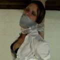 Cinched and Secured Bettie Buxome. Big breasted secretary Bettie Buxome is certainly loyal to her company, so much so that refuses to divulge sensitive and secret information to corporate thugs, even after she’s been tightly bound to a chair! Bright red ropes encircle her ample body, spreading her legs open on the chair so the evildoer can peek up her skirt at will! Glaring at them from behind her eyeglasses, she refuses to talk, so the criminal stuffs her mouth full of a nice squishy silencing packing and wraps her lower face in black medical adhesive wrap to ensure she won’t be calling for help!! Squirming and wriggling in her bonds, she looks around for a way to free herself, grunting into her gag and protesting as the corporate spy opens her crisp white blouse! Her modesty protected only by her bra, she is mortified as her big tits threaten to spill out of the ropes that hold them! Fed up with her uncooperative ways, the spy removes her eyeglasses and wraps the bandages tightly around her head, plunging her into darkness! He leaves her alone to grunt and struggle and shake her tits for whoever is lucky enough to find her! As she thrashes in her darkness, Bettie realizes that corporate loyalty only goes so far!!!