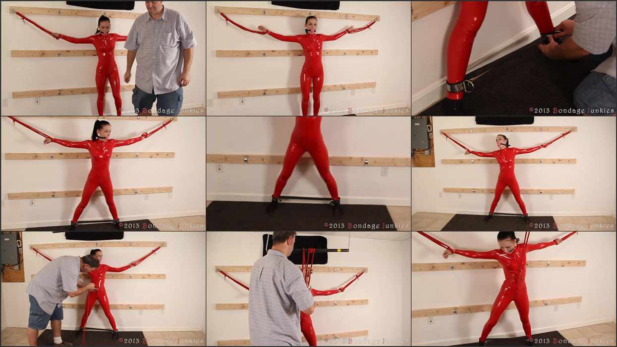 All she wanted was a little play time in the red catsuit. Billie knew that playing dress up had its price, or maybe that was her plan all along? I secure her arms to tethers on either side of the wall somewhat loosely at first and soon followed by a pair of leg spreaders. When more rope is coiled around her waist and between her legs tied off to an overhead pipe everything is pulled tight. With all her slack gone every movement makes the crotch rope pull a little tighter.