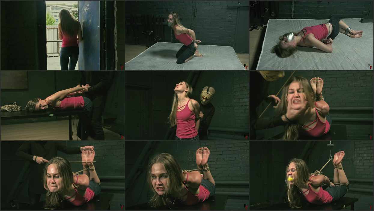 There, Ivanka furiously struggles against the sticky tape and nearly breaks free, but the gang boss catches her again. He ties her into a brutally tight hogtie on the table, arching her body by pulling her up with a ceiling hook. Her bare dirty feet are now completely helpless. The boss spanks and teases them while Ivanka writhes, gagged and muffled by a huge ball stuffed under several strips of transparent tape…