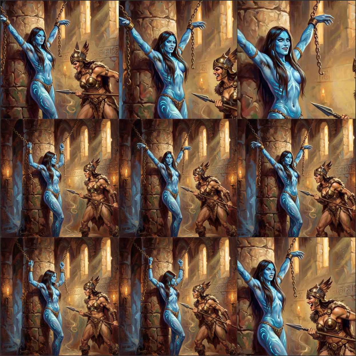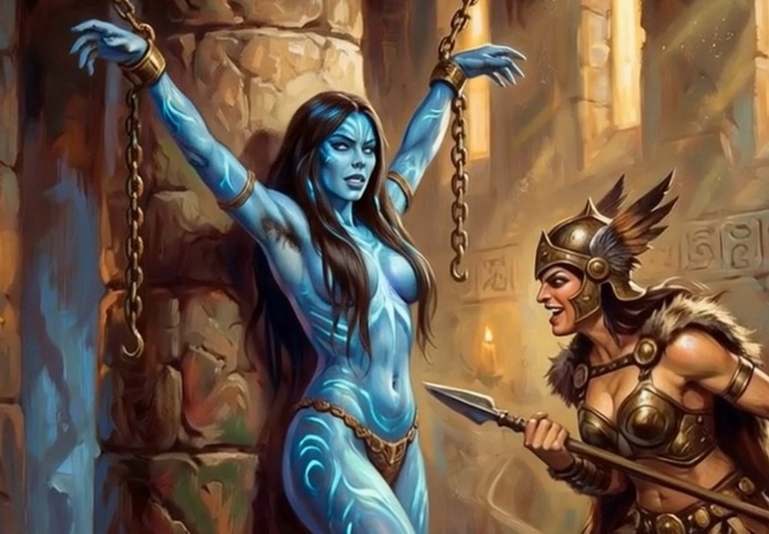 Blue nude fantasy babe with hairy armpits chained in bondage in a BDSM dungeon as a sleve to her evil lesbian Amazon warrior mistress.
