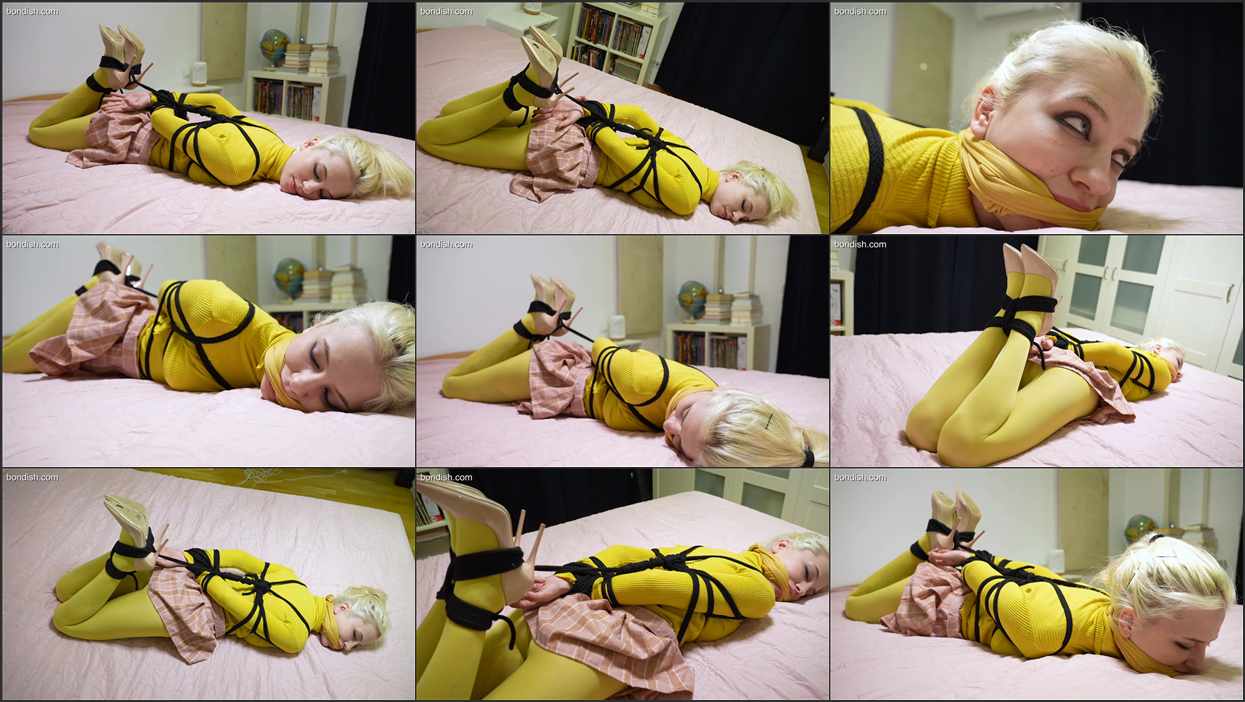 I’m a bondage student, majoring in fetishes and I would like you, my roommate, to help me study. I have a selection of ropes that I want you to us on me. We start off simple, just tied wrists and ankles and I struggle about testing my new bonds, I’m amazed by your rope skills. Next you put me in a hogtie, I get a bit embarrassed as I start getting turned on, the feeling of the ropes on my skin. Your job isn’t finished though until I’m gagged and left to struggle. I’m wearing a miniskirt and a tight fitted top, pantyhose and heels. Lots of shots of feet and hands tightly tied and gagged face.