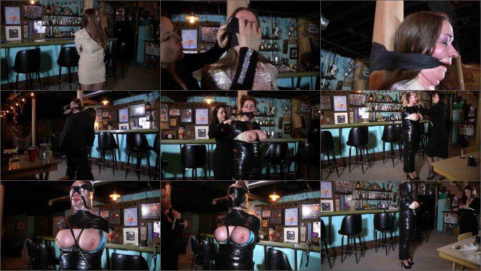 Pepper comes into JJ & Tonys bar. She is acting fishy, fishing for information about the clientele and orders operation. JJ thinks she has to be a cop, but then rethinks it. She is just being too obvious.It dawns on her that she has been sent by a rival organized crime group that throws illegal parties with gambling and prostitution. JJ calls Tony out from another room. He knows what is going on. He quickly grabs the woman and handcuffs her behind the post. She has been rendered helpless now and the couple gets to work interrogating her and covering her in saran wrap. Next she gets a nasty cleave gag with her head attached to the post. Her face is completely distorted and wrap bite into the sides of her gums and crushes her jaw. She looks stressed. It is not over yet when the gag is replaced with the back end of a shoe which opens her mouth wide. It is taped in with electrical tape and a short time later drool starts making it’s way all the way down the shoe and dripping onto the ground. It is hot down there and she is already in a suit and hose and now saran wrap and thick electrical tape. Sweat pours from her brow. More and more of her is taped up including her head and eyes then a lace top stocking is shoved into her mouth. It barely fits with so much bondage on her face. It is held in with some tape. She is groped a bit and left there completely encased, standing in heels with those handcuffs digging in her wrists aside from her incredible boobs while the couple figures out how to handle the situation.