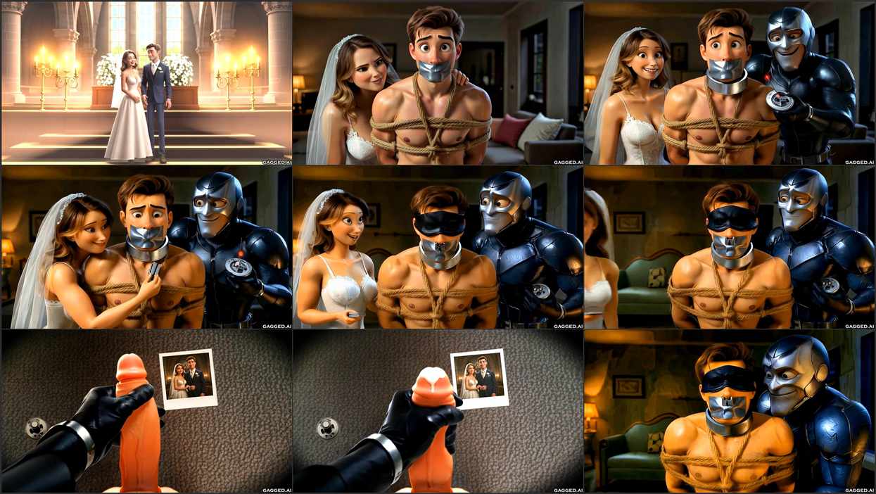 Overflowing with rope bondage, tape gag, blindfold, shock collar electro play, encouraged bi domination, handjob, bridal control, and deep psychological humiliation—this wedding night masterpiece closes with her triumphant, evil laugh: welcome to forever as my slave.