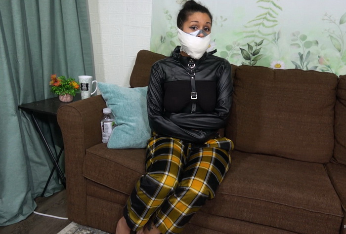 Calisa is a guest in a video for Zahn’s horror channel. She points out that one thing she dislikes about horror movies that include a DID trope is that the bondage is rarely believable. Hands restrained in front, sloppy ropework with no cinching, gags that don’t muffle speech and could be shaken loose in seconds; it’s a joke. She’s confident she could talk through and/or escape any horror movie gag. Zahn suggests they use some time in the video to challenge her. They return from a short break with Calisa secured in a straitjacket and ready to try escaping gags. Zahn plans to make the gags much more effective than the typical horror movie variety, though. Will Calisa still be able to work them off?