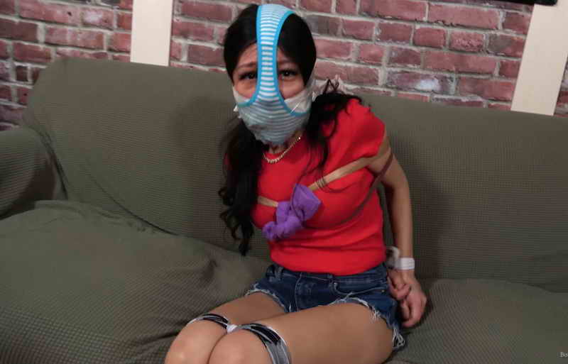 Without her knowledge, a creepy man has been observing Mia, waiting for the perfect time to strike. After days of covert check-ins, he sees that Mia’s dirty clothes hamper is finally full and makes his move, breaking in and grabbing the confused babe. He quickly subdues her, binding her with pantyhose, socks, and scarves from her hamper (tying done off-screen) and is now ready for his favorite part: the gags. He begins by working 2 of her smelly white ankles socks into her cheeks and tying a blue stocking tightly between her teeth. It looks good but seems a little flimsy so he adds a gray slouch sock and a colorful, striped thigh-high sock between her lips. That may just be thick enough to properly muffle the loud-mouthed beauty. Mia struggles futilely for a few minutes before her captor decides to change her gag. This time, he packs her mouth with 3 tan stockings before tying 3 more between her teeth and a 4th over her lips. The man steps back to watch Mia, held firm by her own soiled garments, her mouth moving angrily behind the sheer black stocking. Eventually, the gag is removed but, seeing the pile of panties the intruder brings, Mia knows her mouth won’t be free for long. A big pair of pink satin panties is worked in, held in with a cut pair of large white cotton panties tied between her teeth. A cut pair of pink nylon panties is then tied over her lips. Mia notes that a few of these are too big to be hers and has to fight retching at the thought of another woman’s panties in her mouth, possibly this man’s last victim. She thinks the man has finally left but it turns out he isn’t done, as he eventually returns with more materials. He wraps white vinyl tape over her current gag, pulls a striped thong over her head, and finishes off the gag with turns of clear vinyl tape. This certainly isn’t Missy’s preferred way of being taught not to procrastinate when it comes to doing laundry.