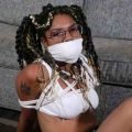 Neighborhood gossip Mia has been spreading false rumors about Zahn cheating on his wife and he wants to make sure she stops and won’t ever do similar again. He storms into her house, grabbing her, and soon has her bound at the wrists, chest, ankles, and feet (done off-screen). Mia denies telling stories but Zahn ignores her, stuffing a big fuzzy sock in her mouth and tying a white cloth over her lips. Tied as she is and wearing a short dress, Mia is unable to keep her panties from showing as she struggles. One gag likely isn’t enough to teach her a lesson, though, so Zahn returns to cram a big piece of memory foam in her mouth and seal it with 9 strips of silver duct tape. Mia hops around as she moans ineffectually into the mouth-filling gag. Next, half of an orange stress ball is shoved in her mouth and 1-inch black electrical tape is wrapped tightly between her teeth. The stress ball is pushed back deep in Mia’s mouth, causing her to drool uncontrollably. As a final measure, Zahn adds a few turns of 4-inch microfoam tape on top. Then he takes his leave, hoping a few hours with the brutal gag will keep Mia from stirring things up in the future.