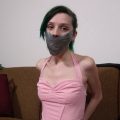 Phoenix gets a purple and white striped sock crammed in her gob, sealed in with 10 sticky strips of silver duct tape.