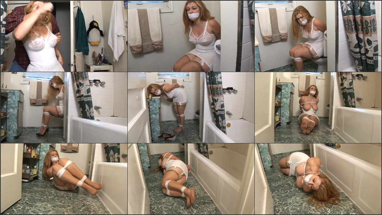 Brigette is getting ready to go to work. After she outs on her make up, she steps out of the bathroom. That is when an intruder comes in and waits for her to return. He grabs her, covers her mouth with hs hand, and struggles to get her under control. When he does, the man ties Brigette up and gags her too.