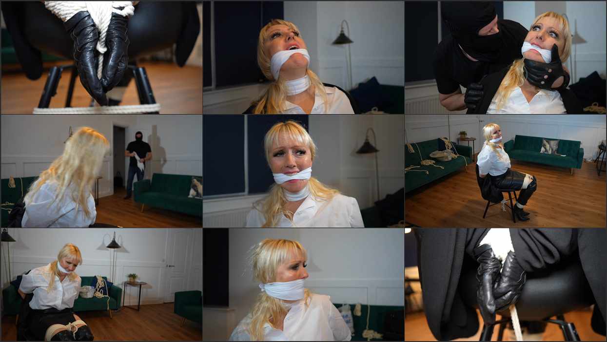 Sexy blonde babe Victoria gets grabbed after returning home. The sexy busty milf finds herself bound tightly to a chair. She struggles against her bonds before the stranger enters the room. Armed with handkerchiefs with intentions of gagging victoria and making her his handkerchief slave. He has been watching victoria for a while a he knows that Victoria uses handkerchiefs in her every day life. This turns the stranger on. The man then gags her with a handkerchief cleave gag and then another because after all one cleave gag is not enough. Victoria is left to struggle and cry into her gag for a while. The rope too tight to loosen. Firmly bound in her secretary clothes, boots and leather gloves the kink hankie loving milf tries defiantly. The man then returns, he teases her and ungags her to let her plead for a while. This is short lived and she is swiftly cleave gagged again with two fresh white handkerchiefs. Again Victoria is left to try and free herself. Some time passes before the handkerchief loving villain returns. This time he is holding her bag and he pulls out one of Victoria’s handkerchies and gives her a tight classic over the mouth damsel gag. Before he silences her with this he has her tell him she loves handkerchiefs. He also tells her his plans for her and tells her hes going to make her his handkerchief slave. Victoria is left for the last time to struggle and contemplate her fate.