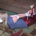 MILF GiGi’s Bondage Fantasies, Busty babysitter Bella Ink lays around relaxing in her skimpy bikini after finally getting those bratty girls into bed. She’s on the phone with her man plotting to have him over later that evening and drinking a cup of coffee that the girls made for her earlier. She falls asleep and when she wakes up she’s very tightly bound. The ropes bite into her skin and she doesn’t know what happened. When she hears the brats giggling she realizes that they put something in her coffee and tied her up. Bella struggles off the couch demanding that they untie her right now but they just giggle and laugh at her. She sees one of the girls waving their momma’s panties in front of her face. Bella rolls her bound body away from them but the next thing she know she’s gagged with the panties in her mouth and her face wrapped super tight with electrical tape. The bratty girls bound her big toes together and used the toe twine to hogtie. Then one of them tosses Bella’s cell phone next to her and walk away leaving their helpless babysitter struggling furiously on the floor trying desperately to grab the cell phone to call for help.