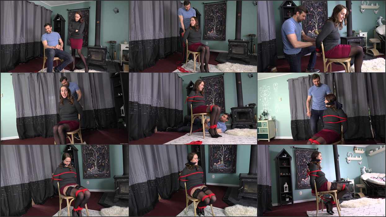 Cadence has been asked to visit her boss Rick at his home, so she goes, fairly sure that he wants to discuss her request for a raise and possibly a promotion. It turns out that this is indeed what he wants to discuss, along with what she needs to do in order for him to consider this seven months before her performance review is due. He explains that he wants to tie her up, right there and then. Cadence hesitates, rather shocked by the suggestion. However, the boss is a good looking man and she wouldn’t mind him doing that to her really, but perhaps she should not look too enthusiastic. After extracting an agreement from him about her raise, she finally concedes to being tied to a chair, and sits down ready. Rick takes his time tying her up, chatting to her the entire time to reassure her that all is well. To finish things off, he cleave gags her at the end, something that also gives Cadence pause. She thinks that he will not release her and her raise is secure, when Rick receives a phone call telling him there is a security breach at work, and his presence is required at once. He tells Cadence he has to run, but will return very soon to untie her. Cadence tries to object to being left like this, especially with her skirt pushed up to the top of her thighs, but Rick doesn’t even pause. As the door closes and she is alone, Cadence resigns herself to her situation.