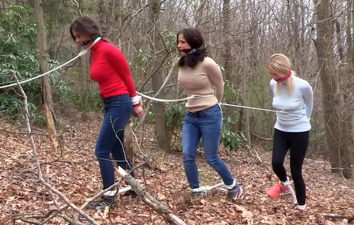 Dave is a thief who has acquired an ancient relic on display at a local museum for the week. He knows the cops will come looking and is anxious to shift the piece; what he does not expect is for three of the museum’s employees to track him down. He sees them arrive via CCTV and park some distance from his house, getting out of their car and fanning out. Evidently, they are planning to approach the house from different directions to optimize their chances of gaining access. Dave calls his employee Pete and asks him to round up the girls, then bring them to the house for interrogation. Pete manages to pick off the girls one by one, tying them up in the woods and linking them together to make them march single file to the house. With their ankles hobble-roped, the girls stumble along and desperately try not to fall as they are led by their captor. As they near the property, Pete hears a vehicle nearby and ties the leash rope to a tree which he goes to check that the coast is clear. The girls seize the opportunity to make an escape attempt. They untie the waist rope on Cadence, the girl at the back, and she tries to get away through the woods to get help.Pete sees her and gives chase, lifting her up and bringing her back to her friends. He re-attaches the waist rope and leads the girls into the house. A little later, they are sitting on the floor lined up against a wall, and both Dave and Pete are asking them questions. It seems the girls were actually trying to recover the relic for the museum. The two men are amused. Dave sends Pete out to move the girls’ car out of sight, and when he returns he is carrying dresses…