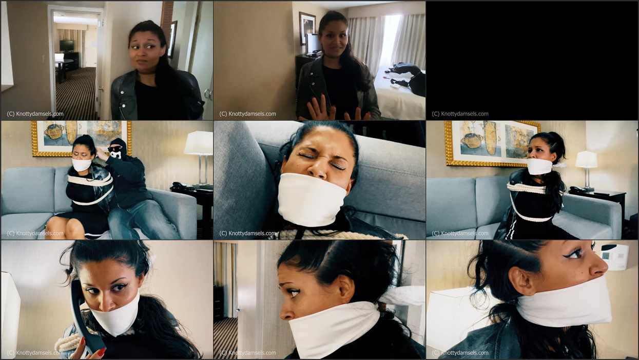 However, as she snoops she hears the door open and she hides. She is caught and tries to talk her way out of hit, but she soon finds herself at the mercy of the man. Calisa is tied up securely and the man leaves, ready to rob a bank to which he will frame her husband, and now holding her will implicate her in the crime as well. To make sure she is silenced, her mouth is stuffed and she is OTM gagged with a white cloth. Calisa squirms and struggles to get free, even trying to call her husband to warn him. Then, she gets her legs free and hides when she hears the door open again, but this time it is her husband, who scolds her on running off to play detective on her own.