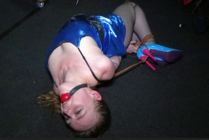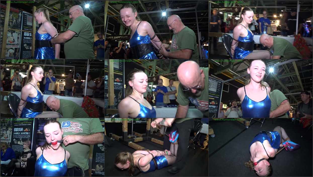 During BoundCon in Munchen, Germany pretty Scottish girl wanted to be tied up by the Hunter. (The clip is shot in the demonstration booth at the convention in front of a live audeince on the convention floor so there is a lot of ambient background noise) Kerry walks in wearing a shiny blue mini dress, stiletto heels and fishnet stockings. She introduces herself and the Hunter asks her questions as he begins to tie her up with thin leather cords. It is Kerry’s first time being bound in leather cords so her reactions a nature as her elbows are slammed togeher and tightly bound in the leather cords. She explains how she feels as the cords bited deep into her flesh as he weaves the cords down her forearms to her wrists. Kerry is all smiles as her arms are welded tightly together behind her back. The Hunter sits her in a chair and continues to interview her as her shapely legs are tied tightly together with more leather cords around her ankles and knees. He then pulls her to her feet, Kerry struggles to keep her balance in her stiletto heels as the Hunter ties a leather cord around her waist then pulls it down between her legs…