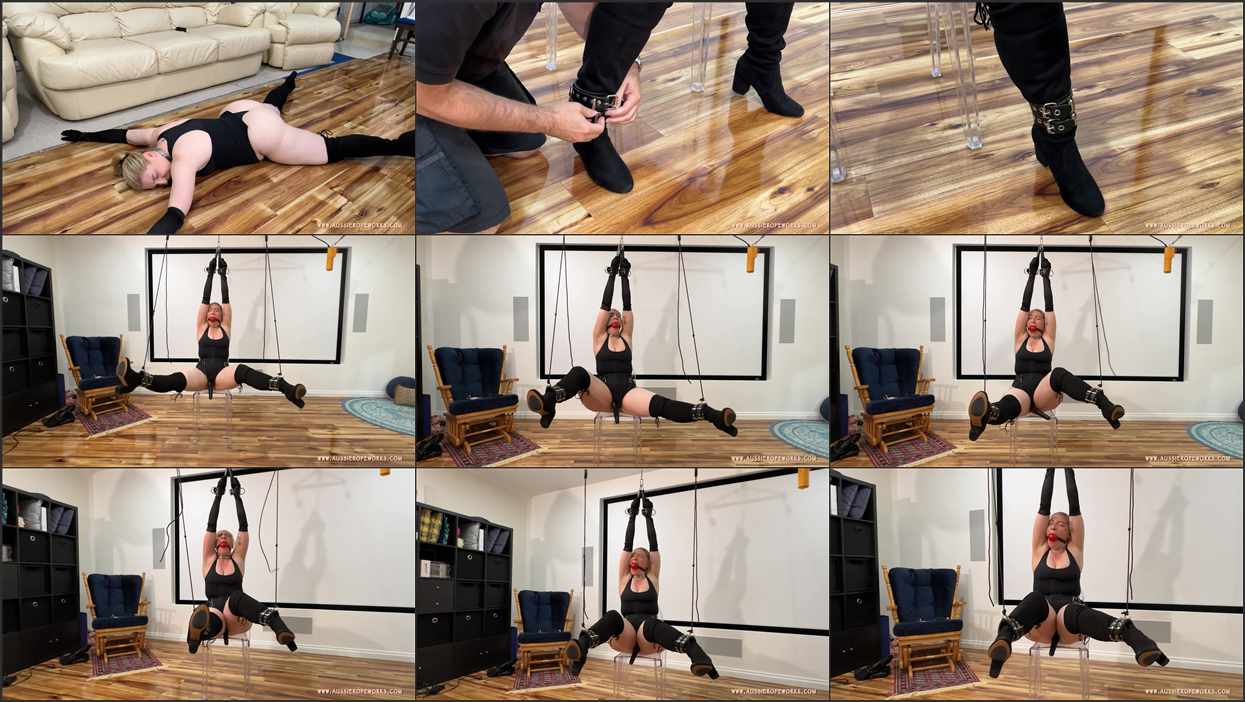 She awakens just as the hoist goes up, pulling her arms up and stretching out her body. She begs for the masked assailant to stop, but he continues to tighten everything and now pulls on the ratchet ropes, pulling her legs up and wide apart. She begs and pleads through her gag as he turns on the wand, and the stimulation hits her body with a jolt. She struggles and pulls on the bonds holding her body tight, but she can’t escape what is being done to her. None of her training came even close to preparing her for this kind of scenario. All the while she tried to think of a way out, but more and more her thoughts were overtaken by the pleasure rising between her legs. Then one thought popped into her head, “what if I can’t get free, what if I can’t escape this?!?” That’s when the first orgasm hit. Her body buckled and jerked, hard, in the bonds holding her. She bounced around and drool escaped from around the massive ball in her mouth. For a moment, she didn’t care where she was, she just wanted this. Then, as the euphoria of the orgasm subsided, she realised her predicament only too well. This would just keep happening again and again, with no hope for release, and no one coming to save her. Now she really tried to struggle hard. She begged, she screamed, but the gag worked too well…