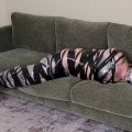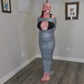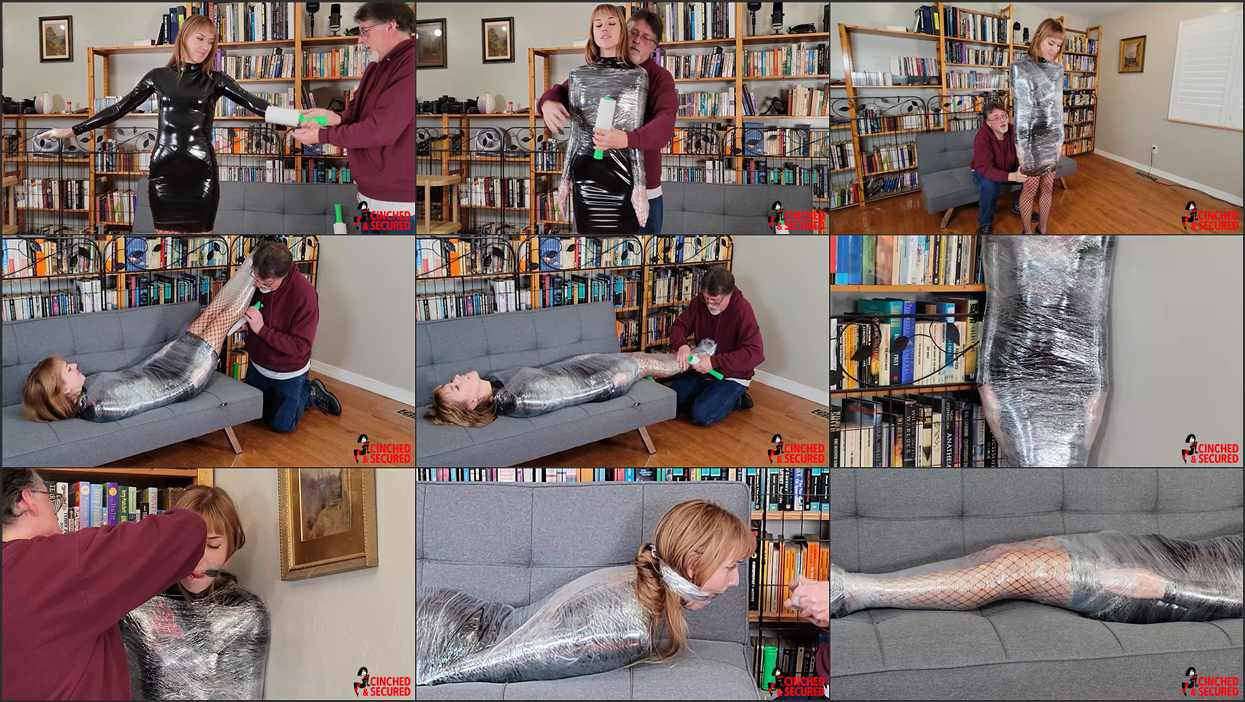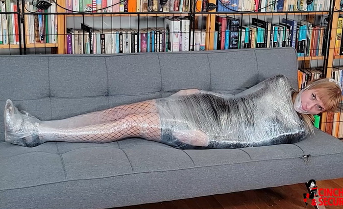 Cara loved the feel of her new latex mini dress! In fact, she wanted more than simply feeling it on her skin. She wanted to be constricted in it, crushed, encased. She sat wrapping plastic wrap around her hand, trapping her fingers into tight little balls. The feeling only fueled her desires, and she asked her friend to help her achieve maximum compression, and he was only too happy to oblige. He wrapped her entire body, from neck to feet, fusing her arms to her sides, turning her legs into one solid column incapable of even bending, and even wrapping her heels to her feet, preventing her from taking even the smallest steps. Finally, he popped a ball gag into her eagerly waiting mouth and propped her standing in the corner. She writhed and moaned, her eyes rolling back in ecstasy as she squirmed and teetered on her fused feet. Her friend, however, decided she needed even more and wrapped the plastic around her face. She stared in shock, unable to speak, and he reversed the path of the plastic, winding it under her chin and over her head again and again. She was now silenced, and he dragged the poor girl to the center of the room, Cara taking pitiful tiny hops to remain upright. She would not stay that way for long, however, as her friend trapped her on her side on the sofa! Completely helpless, Cara rued the moment she had enlisted her friend, and wondered just how long she would remain trapped in her plastic prison!