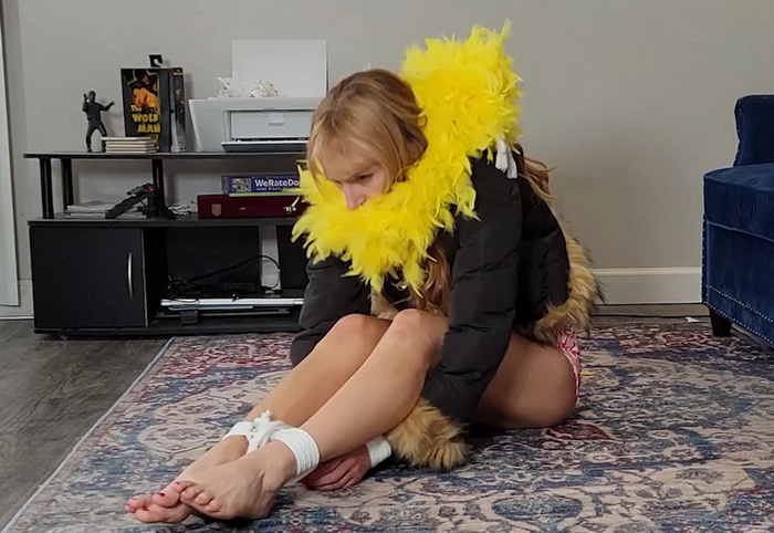 Poor Cara! She was so excited to strut her stuff at the fashion show, but her twin sister tied her up and left her clad in nothing but her underwear and a parka, hardly the outfit Cara would wear to make an impression! Gagged with a feather boa, her struggles to escape the ropes that held her prisoner were totally useless. Of course, she did look VERY sexy as she rolled and writhed, wiggling her toes, arching her soles and displaying that cute little bottom of hers, even if it is clad in striped panties! You could definitely attest to that since you had snuck into the house and stayed to watch the show! Cara finally noticed you and worked her gag free, asking you to untie her and pleading not to be gagged again. Unfortunately, gagged is just how you like yourladies! Sadly, you had to leave and missed the next several minutes of her new struggle session, her mouth silenced by a thick cleave gag, but that’s okay! You’ll just come back later! After all, she won’t be getting loose anytime soon! Or will she?
