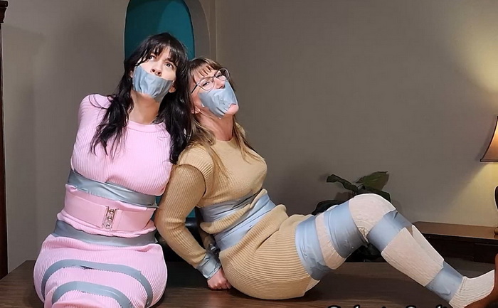 Watch as they gag themselves with a mouthstuffing of red bandannas, sealing them in place with tape strip Baxter gags that turn playful banter into muffled pleasure. Wrists pinned tightly behind their backs as the office mates help each other to get helplessly restrained, legs cinched from ankle to thigh, the tape digs into their tights as they squirm atop the unforgiving desk, heels scraping for leverage in a frenzy of amateur restraint.