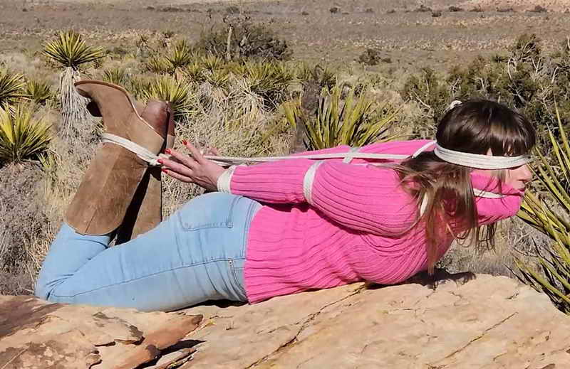 Ben fulfills another of my bucket list bondage experiences; as English Cate is captivated in cowboy boots in the deserts of Nevada. As the stunning vista of Red Rock Canyon leaves an eerie quite around Catherine Sterling, so does Ben. The babe has been bound in an elbow crushing hogtie, with a rope gag attached to brown booted ankles pulling her brunette bangs high in the air. Super thick rib knit turtle neck jumper and jeans are no padding against the rough rock this deserted damsel is left to struggle on… As Ben leaves the lashed lass with a few sting smacks to her denim-clad ass, and a cotton blindfold to boot. Better not roll to far in those ropes, Cowgirl Cat!