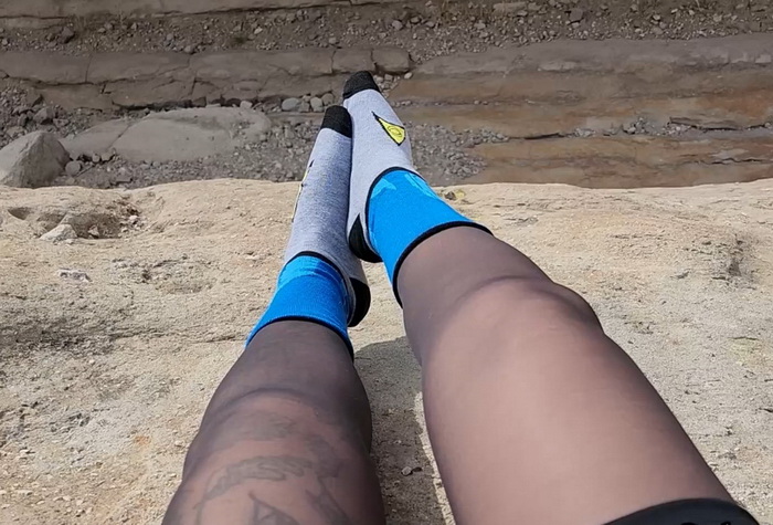 On a trip out to Los Angeles, California and the West Coast USA I just had to visit the site of Kirk meeting the Gorn! Of course that meant my Spock Socks had to have an outing too, while dressing in costume, I donned my favourite bodycon hugging Star Trek-esque uniform dress, complete with garters and stockings underneath. Now at the famous Vasquez Rocks Natural Area Park in Sierra Pelona, LA, I take a wool sock footed walk across the rocky, extra-terrestrial looking terrain of desert sand and stone, admiring my socked feet, nylon sheathed calves and pantyhose-clad thighs all the way, in true nerdy girl fan foot fetish homage to one of my favorite science fiction TV series shows.