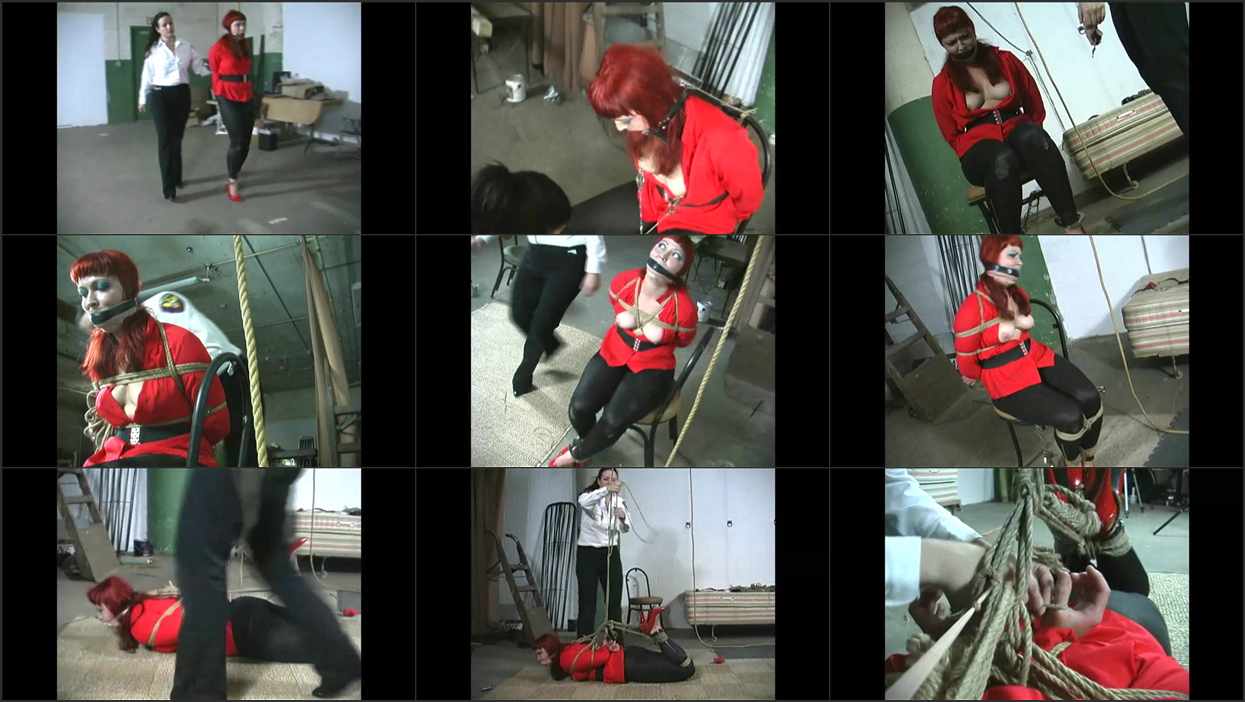 This red headed Peg Bundy wanna be was wandering around my building messing with artwork and trying to get into one of the work spaces. I ran up to her with a fake g*n and put it to her head, told her to get on her fucking knees. She was terrified and got down on her knees, I guess she thought the g*n was real. Then I cuffed her hands, her ankles and elbows and made her walk back to my special space. She was wearing 6 inch heels, which I really enjoyed watching her walk in. Once we got to my door, I put a pretty red ballgag in her mouth. Now she is just perfect. I lead her over to a chair and cuff her hands to the chair and attach her leg irons so she can’t get up and run. I take some pictures of her to sell on the internet. Next I unbutton her shirt and nipple clamp her. She doesn’t like it. I pull the nipple clamps down to the base of the chair, to put her in a more uncomfortable position and then I take some string and tie her gag back to the back of the chair. She’s a bit more snug now and just kind of whining a bit. I don’t like them to move too much. I leave her that way for a while, then I decide it is time to swap out that gag. I stuff her mouth with a shop towel and wrap some bandaging around her buldging mouth and add a little electrical tape. I ask her if she wants me to pull those clamps off fast or slow, I can’t tell what she says so I do one of each. She gets a little fiesty until I remind her that she could go to jail instead. I uncuff her hands and begin to tie her up ( all tieing on screen)…